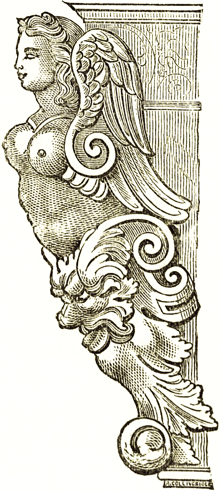 A school of painters arose in the reign of Louis the fifteenth who devoted themselves to the decoration of room woodwork and ceilings; Charles Delafosse, Antoine Coypel, Jean Restout, and many pupils. We must associate the names of these artists with those of the Le Pautre family. Jean died before the end of the seventeenth century, but Pierre took part in the later works of the Louvre and of Versailles under Jules Hardouin Mansard, "surintendant des bastiments." Juste Aurèle Meissonnier did still more to make this showy work popular. He designed all sorts of room furniture and woodwork. It is amongst the published works of these artists that we must seek the eighteenth century designs of French fashion. Painted panels were inserted into the wood ceilings, over the tops of looking-glasses, and dessus-portes or the short panels between the tops of doors and the line of cornice. These are generally in chiaro scuro, or light and shade [pg 105] only, and represent families of cupids. Nymphs and fauns, shepherdesses, and the supposed inhabitants of a fanciful Arcadia, formed the general subjects of room decorations.