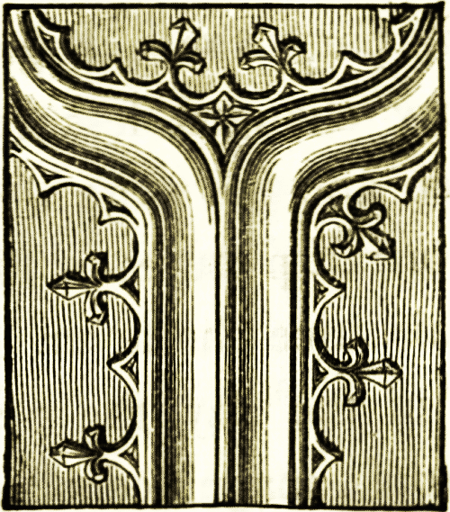 The earliest type of the architectural thrones or chairs of the middle ages is the ancient chair of St. Peter, at Rome, of which a woodcut has been given in p. 35. A full description and plates of it will be found in the "Vetusta monumenta" of the Society of antiquaries for 1870. Another famous chair, that of St. Mark, is preserved at Venice, in the treasury of St. Mark's. Anciently this chair, like that of St. Peter in Rome, was covered with plates of ivory, carved panels probably fitted into frame pieces of wood as a covering to the stone. As it is now seen, however, the work is of oriental marble. It is a rudely shaped arm chair, with high back sloping upwards in the form of a pediment, truncated and surmounted by a stone, cut into an imperfect circle or oval, and having an arm or volute like the reversed angle-volute of a column projecting from the lower part of each side. The chair of St. Maximian at Ravenna dates from the [pg 123] sixth century; this is described in Mr. Maskell's "Ivories." A magnificent fourteenth century architectural chair of silver is preserved at Barcelona. The supports represent window tracery. One large arch supplies the front support, being cusped, and these cusps are again subdivided. The two sides form each a pair of windows of two lights or divisions, with a circle above, the whole cusped and having trefoil leaves on the cusps. The back is open tracery work, representing three narrow windows, with two lights or openings each. They finish in three lofty gables, crocketed outside and divided into tracery within.