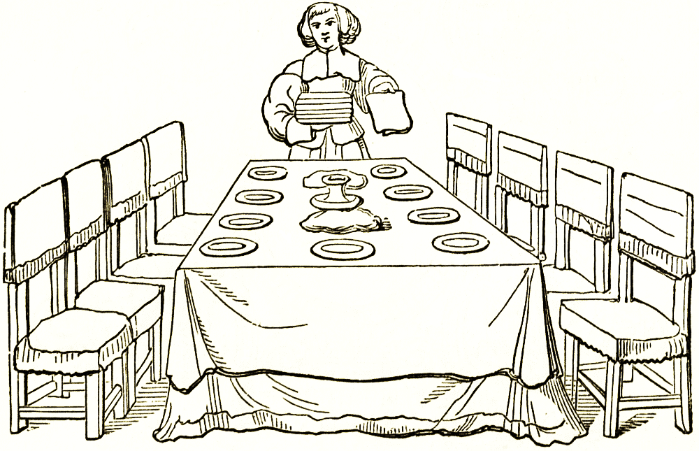 There are several old sideboards in the Kensington museum, described under the names of dressoir or dressoir de salle à manger in the large catalogue. They are small cupboards and would be called cabinets but for the drawers half-way down, and the rows of the shelves on the top; and are of the sixteenth century date. According to Willemin, the old etiquette of France, certainly that of Burgundy, prescribed five steps or shelves to these dressers for use during meals for queens; four for duchesses or princesses; three for their children and for countesses and grandes dames; two for other noble ladies. In [pg 129] the middle ages cupboards or dressers were mere covered boards or shelves against a wall on which plate was set out, and were made of three or four or more stages according to the splendour of the occasion. The cupboard dresser of more modest pretensions was considered as a piece of dining-room furniture. It was ordinarily covered with a piece of embroidery.