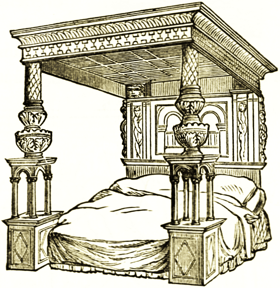The finest examples of bedsteads that can be called mediæval are French, and only met with in fragments, or more or less complete. This is unfortunately the case also as regards early English bedsteads. We may refer the reader to the "Mobilier Français" of Viollet le Duc, for an idea of the sumptuous carved [pg 119] oak bedstead of the great palaces and hotels of France. It was a frame panelled down to the ground, often containing chests, drawers, presses, or other safe places under the sleeper. The back resembled more or less the reredos of an altar, or the great panelled presses that filled the sides of sacristies. Four posts supported the canopy. A bedstead of the fifteenth century was long preserved at Leicester, and said to have been slept on by Richard the third. The under part of it formed his military chest, and the discovery of the treasure a century afterwards occasioned a barbarous murder. None of the coin found was of a later mint than his reign. It is also said by Pennant that a stump bedstead still in Berkeley castle is the same on which the murder of Edward the second was committed. Fine examples of Tudor bedsteads are preserved there. In the town of Ware in Hertfordshire is, and has long been, an inn under the sign of the Saracen's head, "In this," says Clutterbuck, "there is a bed of enormous proportions, twelve feet square. The head is panelled in the Elizabethan style of arched panels, and a date is painted on it—1460. [This, however, is not authentic.] It is of carved oak. The top is covered by a panelled tester, supported on baluster columns at the feet. The bases of these rest on a cluster of four arches or supports to each column." Nothing is known of the original history of the bedstead. Shakespeare alludes to it in Twelfth Night.
