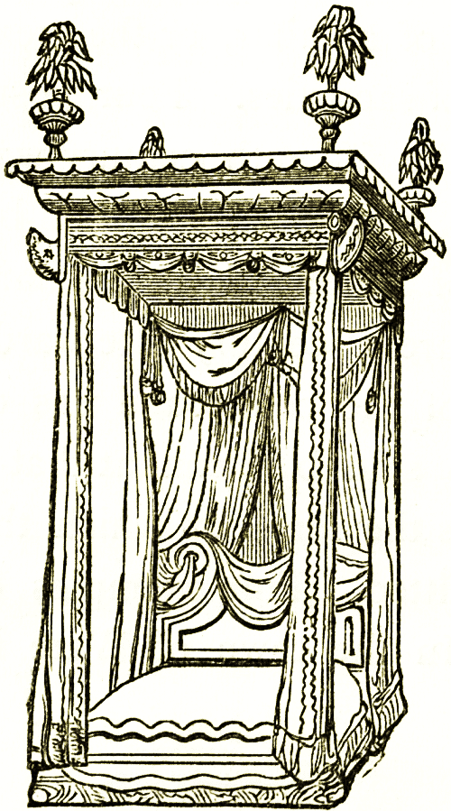 To the Tudor and Jacobean period of heavy oak furniture succeeded the custom of supplying the place of oak-panelled testers [pg 120] and headboards with rich hangings either of tapestry, cut Genoa, or Venice velvets and other costly materials, with ostrich feathers or other ornaments on the angles. The royal beds at Hampton court admirably illustrate this stately fashion, as in the accompanying woodcut. More modern changes it is unnecessary to trace.
