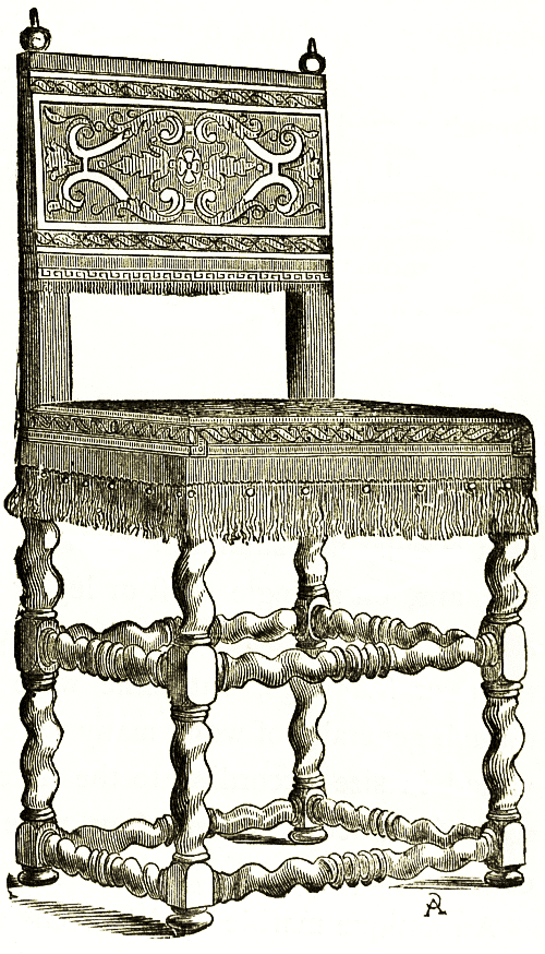 Chairs in England during the mediæval period were sometimes made of turned wood. Sometimes they were cleverly arranged to fold up, as in our own days: the engraving (p. 122) is from a beautiful manuscript of the fifteenth century. The chair known as that of Glastonbury is a square board on two pairs of cross-trestles, with a square board for a back, held to the seat by sloping arm pieces, shaped out to receive the arms of a sitter. On the edges of the seat and back tenons protrude, long enough to pass through mortices in the leg and arm pieces, which are pegged to keep them firm. Like the sixteenth century curule chairs these can easily be taken to pieces for travelling. [pg 124] During the reigns of Elizabeth and James, high-backed chairs, richly cut and pierced, with wooden, afterwards with cane, seats were used and remained in use simplified and lightened during more than a century. The woodcut (p. 123) represents the fashion of chair common in Italy about the year 1620: and from thence introduced into England.