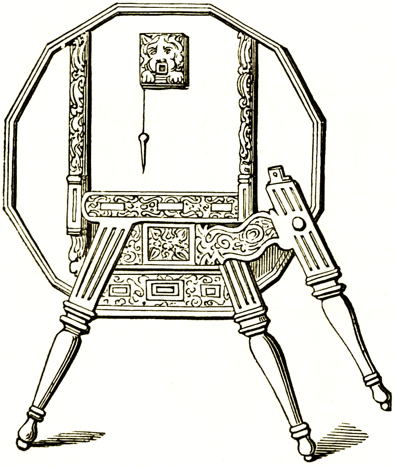 The history of French furniture is in general the history of that of other nations. The art of wood carving was still maintained in [pg 106] Italy and applied, as in the instance of this distaff, to utensils of all kinds. In England we had, about the middle of the century, a school of carvers, gilders, and ornamenters following the extravagant style of the French. The most prominent name is that of Thomas Chippendale, who worked from the middle till towards the end of the century. He was descended from a family of carvers, and inherited the skill which had been general in his craft since the days of Gibbons. We find much rococo carving on bed testers, round fireplaces, over doors, &c., in our English houses built during the reign of Anne and the two first Georges. Other pieces of furniture, such as carved tables, wardrobe cabinets, chair backs or dinner trays, go by Chippendale's name. They are in mahogany, and follow the architectural moulding lines often seen in the works of Sir William Chambers and the brothers Adam.