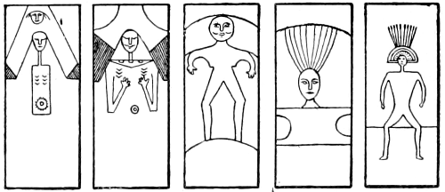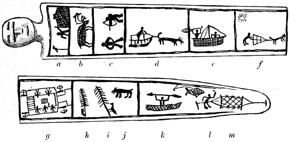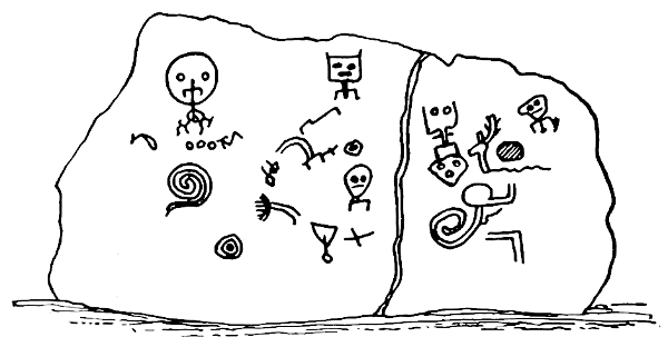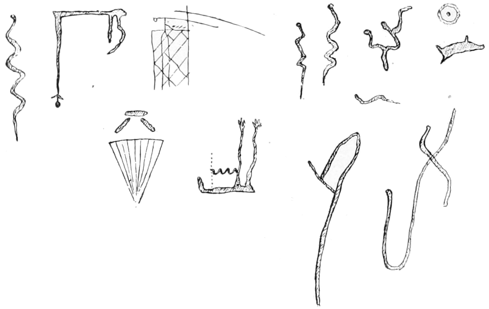 Early in the month of July Col. Garrick Mallery proceeded to Maine, Nova Scotia and New Brunswick to continue investigation into the pictographs of the Abnaki and Micmac Indians, which had been commenced in 1887. He first visited rocks in Maine, on the shore near Machiasport, and on Hog island, in Holmes bay, a part of Machias bay. In both localities pecked petroglyphs were found, accurate copies of which were taken. Some of them had not before been reported. They are probably of Abnaki origin, of either the Penobscot or the Passamaquoddy division, the rocks lying on the line of water communication between the territories of those divisions. From Maine he proceeded to Kejemkoojik lake, on the border of Queens and Annapolis counties, Nova Scotia, and resumed the work of drawing and tracing the large number of petroglyphs found during the previous summer. Perfect copies were obtained of so many of them as to be amply sufficient for study and comparison. These are incised petroglyphs, and were made by Micmacs. The country of the Malecites, on the St. Johns river, New Brunswick, was next visited. No petroglyphs were discovered, but a considerable amount of information was obtained[xiii] upon the old system of pictographs on birch bark and its use. Illustrative specimens were gathered, together with myths and legends, which assisted in the elucidation of some of the pictographs observed elsewhere.