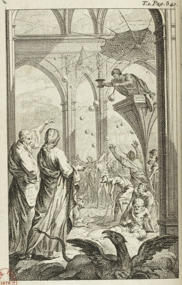 "Madam," continued Selim, "we had spent the night at a masquerade in the great salons in the Seraglio, when the genius Cucufa, a vowed protector of the reigning family, appeared to us, and commanded us to go to bed, and sleep twenty four hours on a stretch. He was obeyed, and at the expiration of this term, the Seraglio was found to be transformed into a vast and magnificent galery of Pantins. At one end appeared Kanaglou seated on his throne: a long pack-thread, almost worn out, hung down between his legs: an old decrepit fairy was incessantly pulling it, and with a turn of her wrist, moved an innumerable multitude of subaltern Pantins, to whom fine imperceptible threads answered, which issued from Kanaglou's fingers and toes. She pulled, and in an instant the seneschal drew up, and sealed ruinous edicts; or pronounced a panegyric on the fairy, which was prompted by his secretary: the minister of war sent card matches to the army; the superintendant of the finances built houses, and suffered the soldiery to starve; and so of the other Pantins.