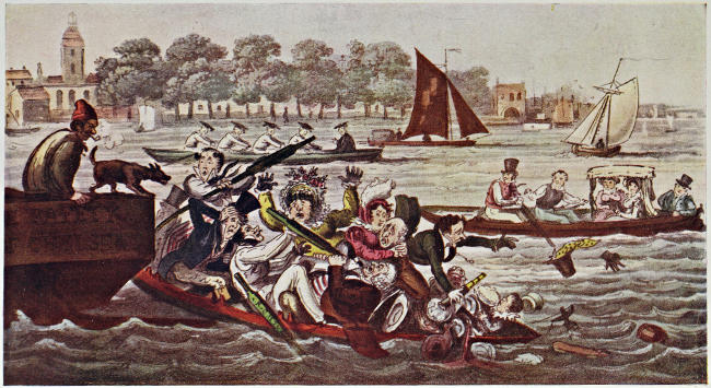 [463] Funny-movers attended to the boats. A funny was a narrow, clinker-built pleasure boat for a pair of sculls. “A most melancholy accident happened one evening this week in the river off Fulham. A young couple, on the point of marriage, took a sail in a funny, which unfortunately upset, and the two lovers were drowned” (Annual Register, 1808).