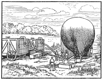 This danger of fire was done away with in the method of filling with hydrogen gas. The balloon, suspended from aloft as before, was connected by hose-pipes with a number of casks containing iron or zinc filings upon which dilute sulphuric acid was poured. The effect of mixing these substances together is to set up a brisk chemical action, in the course of which hydrogen gas is given off. In this case the hydrogen thus liberated came through the pipes and filled the balloon. The great disadvantages of this method of filling—which, it may here be mentioned, is occasionally employed at the present day—are the long time it occupies, the great labour entailed, and the enormous expense.