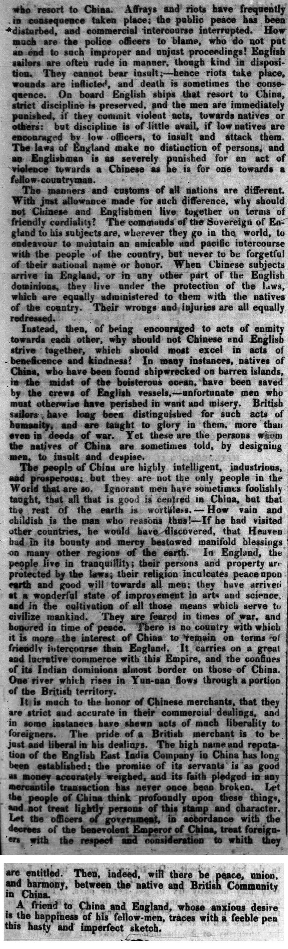 | It is much to the honor of Chinese merchants, that they are strict and accurate in their commercial dealings, and in some instances have shewn acts of much liberality to foreigners. The pride of a British merchant is to be just and liberal in his dealings. The high name and reputation of the English East India Company in China has long been established; the promise of its servants is as good as money accurately weighed, and its faith pledged in any mercantile transaction has never once been broken. Let the people of China think profoundly upon these things, and not treat lightly persons of this stamp and character. Let the officers of government, in accordance with the decrees of the benevolent Emperor of China, treat foreigners with the respect and consideration to which they are entitled. Then, indeed, will there be peace, union, and harmony, between the native and British Community in China. | 清國商人多爲公平勤功辦事,且或時向遠商有仁義大量之厚行。英國商人所以爲貴者,係公 道豐厚交易,即如英國公班衙,派人駐粵貿易者,由來已久,有名聲矣。其主事人等,所應許爲 妥當,若經照數收銀両全完,則向來做生理,伊所應承,從未一次反口。茲請大清國人民,深想 上陳之各條,不要經視這種才具品行之人,且奉官職者,宜敬體大皇帝厚待禮接遠人之至意。則 果然將來在中華之英人與內地人民,固爲彼此友見和睦,各安本業享福矣。 |