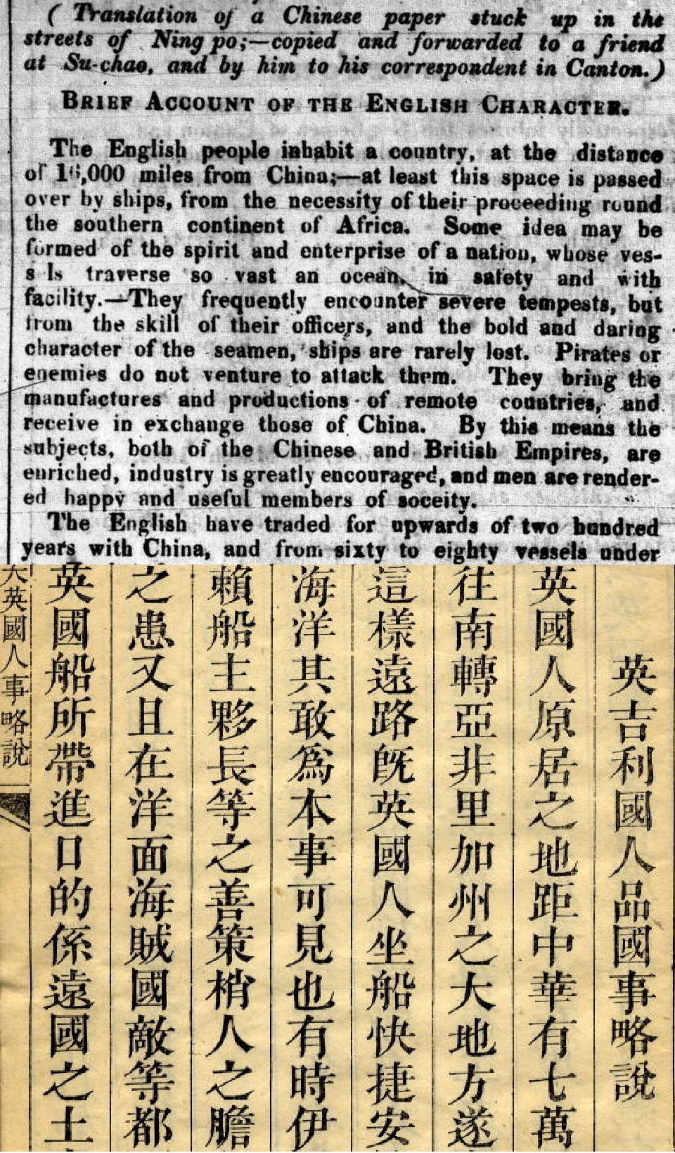 | The English people inhabit a country, at the distance of 16,000 miles from China;—at least this space is passed over by ships, from the necessity of their proceeding round the southern continent of Africa. Some idea may be formed of the spirit and enterprise of a nation, whose vessels traverse so vast an ocean, in safety and with facility.—They frequently encounter severe tempests, but from the skill of their officers, and the bold and daring character of the seamen, ships are rarely lost. Pirates or enemies do not venture to attack them. They bring the manufactures and productions of remote countries, and receive in exchange those of China. By this means the subjects, both of the Chinese and British Empires, are enriched, industry is greatly encouraged, and men are rendered happy and useful members of society. | 英國人原活之地,距中華有七萬里之遠;即是其船,往南轉亞非里加州之大地方,遂來東 北到粵必行這樣遠路。既英國人坐船快捷,安然渡行,汎此重大海洋,其敢爲本事可見也。有時 伊遇著狂風大作,但賴船主夥長等之善策,梢人之膽行,未幾何致破船之患。又且在洋面海賊國 敵等,都不敢向攻也。英國船所帶進口的係遠國之土產之製造各物,所帶出口者係華夏之茶葉等 貨。如是華、英兩國商人發財裕國,且貧民有工夫做得飯食,爲良人度日,享此福矣。 |