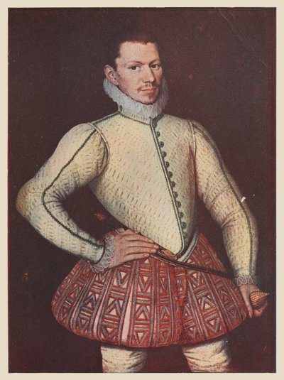L’HOMME est campé dans une attitude aisée, fière, qui révèle un soldat sous l’ajustement du courtisan. La tête énergique, aux traits accentués, encadrée de cheveux rudes, fait penser à ces gentilshommes batailleurs dont la France tout entière fut le champ clos à l’époque des guerres de religion. La douceur n’était pas leur vertu; ils n’avaient de respect que pour la force. Féroces dans le combat, impitoyables dans la victoire, ils commettaient au nom de Dieu les pires atrocités et donnaient carrière, sous le couvert de convictions religieuses, à leurs instincts de violence et de rapine, allant parfois jusqu’à se mettre en révolte ouverte contre l’autorité royale. L’inconnu de ce petit tableau dut être un de ceux-là: il y a de l’audace dans le regard, de la dureté dans les lignes du visage, de la sévérité dans les lèvres étroitement closes. Une large fraise tuyautée encadre la mâle figure du personnage. Le haut du corps est pris dans un pourpoint d’un blanc crémeux fermé sur la poitrine par un rang de boutons et qui se termine en pointe à la ceinture, selon la mode du temps. La main gauche serre la poignée de l’épée, tandis que la droite s’appuie sur la hanche. Le haut-de-chausses, raide comme un corselet d’acier, se compose de riches passementeries rouges appliquées sur un fond crème, semblable à celui du pourpoint. On ne voit qu’une partie des jambes, jambes nerveuses et souples d’un homme que n’ont pas énervé les plaisirs et l’oisiveté de la Cour.