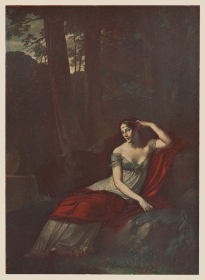 SUR le désir même de l’Impératrice, Prud’hon a placé son auguste modèle en un paysage agreste, dans les bosquets de la Malmaison. De grands arbres au feuillage épais forment un joli coin d’ombre qui ne laisse apercevoir qu’un mince pan de ciel. Sur une sorte de banc naturel formé de roches, Joséphine de Beauharnais, femme de Napoléon et impératrice des Français, repose son corps souple et charmant de créole. Son bras gauche replié s’appuie sur la pierre formant dossier et la main aux doigts fuselés soutient la tête fine, encadrée de cheveux noirs. Le bras droit tombe naturellement le long du corps et vient s’appuyer sur un grand manteau pourpre placé sous elle et dont l’extrémité s’enroule sur les genoux. Ce manteau n’est pas là seulement pour protéger l’impératrice contre l’humidité de la pierre; il a certainement aussi comme fonction de faire valoir par le contraste la mousseline de la robe et le grain satiné des chairs. La tête est légèrement inclinée à droite, dans une pose de rêverie; avec son ovale allongé, ses yeux noirs pleins de douceur, son nez droit un peu relevé vers la pointe, sa bouche grande et souriante, le visage possède une grâce menue et puérile. La robe est largement décolletée, simplement retenue aux épaules qu’elle laisse voir ainsi que la rondeur des seins. Un cordon placé haut au-dessus de la taille, à la mode du temps, sert de ceinture. Sous la mousseline souple, les jambes longues se dessinent et s’appuient, chaussées de brodequins en satin blanc, sur un épais tapis de mousse.