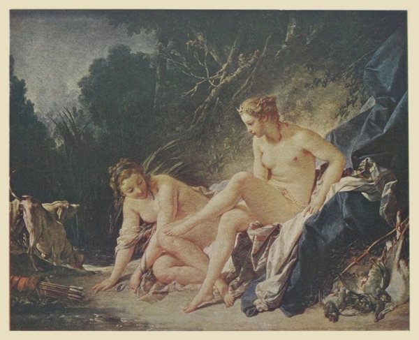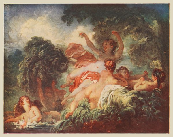 Les Baigneuses appartiennent évidemment à ce monde aimable et court vêtu. Elles n’ont pas, certes, la mièvre finesse des petites marquises Louis XV, et certainement Fragonard a prétendu peindre des Naïades ou des Nymphes, mais c’est toujours la Femme, attirante et capiteuse, énigme troublante et vivante, déesse radieuse dont le pouvoir n’a pas diminué depuis l’époque lointaine où Vénus régentait l’Olympe.