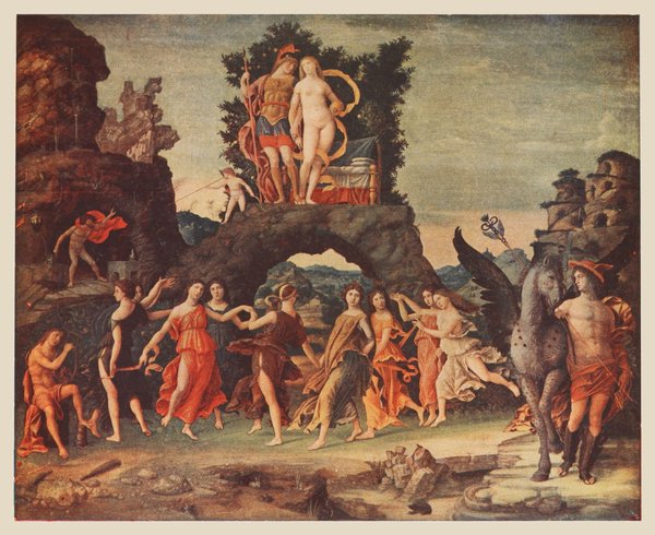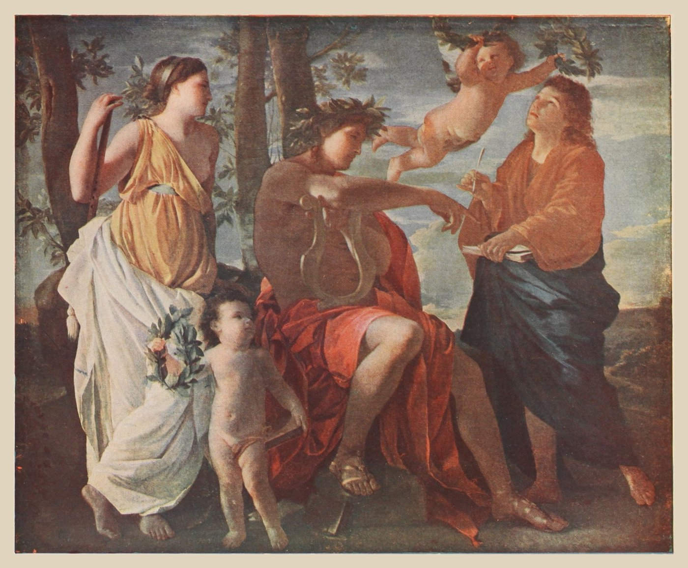 AU pied d’un arbre, Apollon, dieu des arts, est assis, un large manteau drapant son corps superbe d’Olympien. Sa tête est couronnée de feuillage, et son bras droit, appuyé sur sa lyre, est dirigé vers les tablettes d’un jeune poète qui, le visage illuminé d’une flamme idéale, sent pénétrer en lui le souffle divin de l’inspiration. Deus, ecce Deus! Le visage frémissant du néophyte traduit à la fois la joie, la ferveur et l’extase. Au-dessus de sa tête vole un Amour, porteur de couronnes dont il va ceindre le front du poète. Vers lui se tourne également un autre Amour, armé du carquois symbolique, qui semble lui promettre d’autres lauriers, aussi doux que ceux de la gloire. Derrière le dieu, et contemplant la scène, une femme d’une idéale beauté, muse ou déesse, écoute d’un air ravi les strophes inspirées du jeune et charmant rapsode.