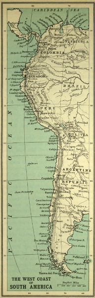 The littoral floras of the West Coast of South America.—The Convolvulus soldanella zone of Southern Chile.—The plantless or desert zone of Northern Chile.—The Sesuvium zone of Peru.—The Mangrove zone of Ecuador and Colombia.—The two varieties of Rhizophora mangle, the “mangle chico” and the “mangle grande.”—The floating vegetable drift of the Guayaquil River.—The Humboldt current and the climate of the West Coast of South America.—The advance northward of the arid climatic conditions of the Peruvian sea-border.—The retreat of the mangroves.—Evidence of ancient coral reefs on the coast of Peru.—The shore plants and stranded seed-drift of the Panama Isthmus.—Summary.