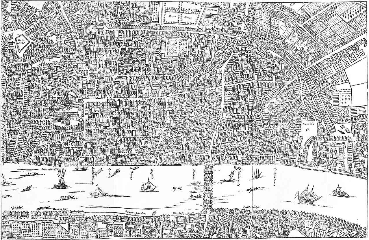 By the river bank among wharves and quaint mediæval warehouses, St. Magnus’ steeple, the stern towers of Baynard’s Castle, and the buildings of the Blackfriars are conspicuous; while in the same direction, and beyond the Fleet river, is Bridewell Palace, the huge tower of the Whitefriars, the Temple, St. Dunstan’s Church, Exeter House, Arundel House, the Savoy, and York Place. Along the eastern limits of the City are St. Dunstan’s, St. Margaret Pattens, All Hallows Barking, the great Minster of the Friars of the Holy Cross, and the still larger Priory of the Holy Trinity in Aldgate.18 Near Bishopsgate is the large establishment of the Augustinians, and beyond this again the Grey Friars, the Priory of St. Bartholomew, the Charter House, and the Priory of St. John, Clerkenwell. In the centre of the City is an almost endless array of parish churches, with here and there the high-pitched roof of some guild house, or the residence of a nobleman or wealthy merchant.