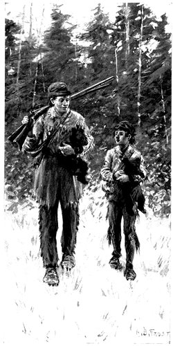 The boys placed five or six traps upon the beaver paths on each side of the creek, and then continued their journey up stream until they found a little opening in the ice down to which, from the bank above, ran a well-beaten path, telling plainly of the many kinds of animals that had been going there to drink. There they set a few traps and baited them with small pieces of bear meat, and then they returned home, intending to visit the traps next morning at an early 271hour, and hoping to reap a rich harvest of pelts.