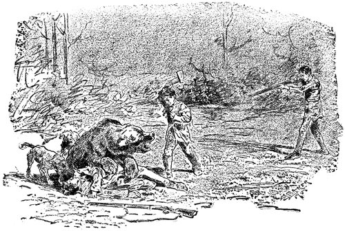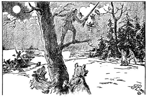 You may be sure that the boys lost no time in making their exit also. Their first thoughts, of course, were of each other, and when Balser learned that Jim and Tom had received no serious injury, he quickly turned his head in the direction whence the bear and dogs had gone, and saw them at a point in the bend of the creek not fifty yards away. The bear had come to bay, and the dogs 261were in front of him, at a safe distance, barking furiously. Then Balser’s courage returned, and he hastily went into the tree, brought out his carbine, and hurried toward the scene of conflict. The moon was at its full, and the snow upon the trees and upon the ground helped to make the night almost as light as day. The bear was sitting erect upon his haunches, hurling defiant growls at the dogs, and when Balser approached him, the brute presented his breast as a fair mark. Tom also fetched his gun and followed closely at Balser’s heels. The attention of the bear was so occupied with the dogs that he gave no heed to the boys, and they easily approached him to within a distance of five or six yards. Tom and Balser stood for a moment or two with their guns ready to fire, and Balser said: “Tom, you shoot first. I’ll watch carefully, and hold my fire until the bear makes a rush, should you fail to kill him.”