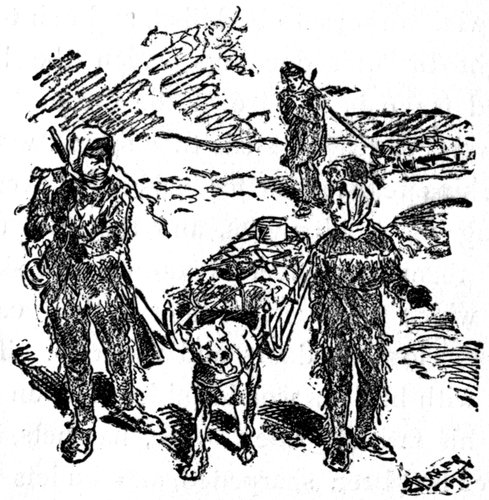 Tom and Tige drew one of the sleds, and Balser and Prince drew the other. During the first part of the trip, Jim would now and then lend a helping hand, but toward the latter end of the journey he said he thought it would be better for him to ride upon one of the sleds to keep the load from falling 245off. Balser and Tom, however, did not agree with him, nor did the dogs; so Jim walked behind and grumbled, and had his grumbling for his pains, as usually is the case with grumblers.