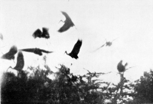 The dark forms of these fishing-birds present a strange appearance in full flight. They speed past you swiftly, looking more like survivals from some earlier age than like birds of our own day. There is a suggestion of flying lizards about them. Here they come, describing a great 330 curve along the river’s course, at a fair height. They are returning to their nests, and as they draw near I get a better chance of observing the varying phases of their flight.