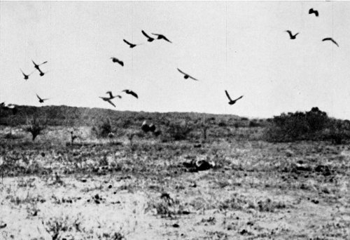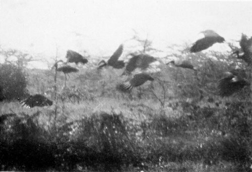 TELEPHOTOGRAPHS OF BIRDS ON THE WING. FIRST ROW: THE STORK-VULTURE (SERPENTARIUS SERPENTARIUS [MILLER]). SECOND ROW: HAMMERHEAD (SCOPUS UMBRETTA, Gm.), SMALL BUSTARD (OTIS GINDIANA [OUST]) SADDLE STORK (EPHIPPIORHYNCHUS SENEGALENSIS [SHAW]). THIRD ROW: BATELEUR EAGLE (HELOTARSUS ECAUDATUS [DAUD.]), VULTURE (PSEUDOGYPS AFRICANUS SCHILLINGSI, Erl.), MARABOU (LEPTOPTILOS CRUMENIFER, [CUV.], Less.).