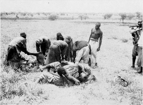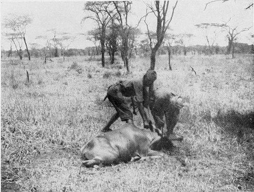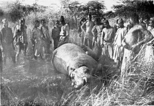 PREPARING TO SKIN A HIPPOPOTAMUS. THE PRESERVATION OF THE HIDE OF THIS SPECIMEN PROVED UNSUCCESSFUL. IT IS ALMOST IMPOSSIBLE TO PRESERVE HIPPOPOTAMUS-HIDES WITHOUT HUGE QUANTITIES OF ALUM AND SALT, BOTH VERY HARD TO GET IN THE INTERIOR OF AFRICA. THE SKIN OF THE HEAD IS THINNER AND MORE MANAGEABLE THAN THAT OF THE REST OF THE BODY.