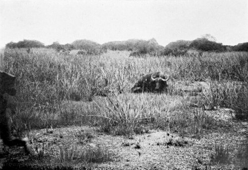 The hunter, however, who without real hope of overtaking the elephants themselves yet persists in following up their tracks just because they have so much to tell him, will be all the readier to turn aside presently, enticed in another direction by the scarcely less notable traces of a herd of buffaloes. Follow these now and you will soon discover that they too have found safety, having made their way into an impenetrable morass. To make sure of this you must perhaps clamber up a thorny old mimosa tree, all alive with ants—not a very comfortable method of getting a bird’s-eye view. Numbers of snow-white ox-peckers flying about over one particular point in the great wilderness of reeds and rushes betray the spot in which the buffaloes have taken refuge.