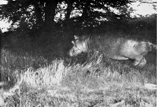 A POWERFUL OLD HIPPOPOTAMUS ON HIS WAY TO HIS HAUNT IN THE SWAMP AT DAYBREAK. ONE OF MY BEST PHOTOGRAPHS.