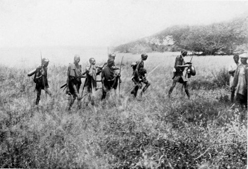 A PARTY OF WANDOROBO HUNTERS COMING TO MY CAMP. I GOT SEVERAL OF THEM TO ACT FOR ME AS GUIDES.