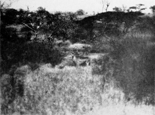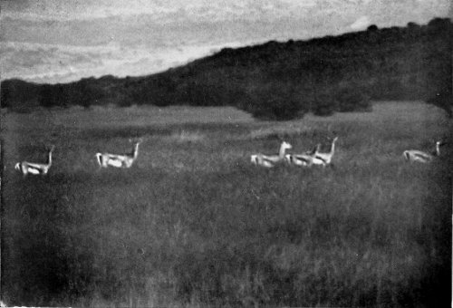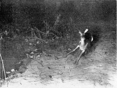 FLASHLIGHT FAILURES II. BLACK-HOOFED ANTELOPES COMING DOWN TO THE WATER-SIDE TO DRINK. THE BLEMISHES WERE CAUSED BY BITS OF THE MATERIAL WITH WHICH THE FLASHLIGHT POWDER WAS COVERED TO PROTECT IT FROM DAMP BEING BLOWN INTO THE AIR AND BURNING AS THEY FLEW IN FRONT OF THE LENS.