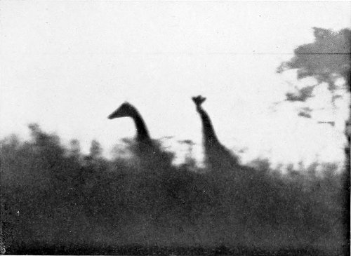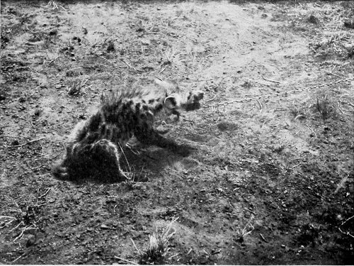 This picture, taken in the early morning, is a good instance of the way in which I have always enforced my rule as to never touching up my photographs. The plate was broken on its way home, but the cracks which resulted were left as they were.21 I remember one case in which I had put up my apparatus with a view to securing photographs of certain lions, and in which I had to be content with a picture of a spotted hyena splashing its way in full flight through the swamp. The hideous 706 cowering gait of the animal came out very strikingly on the negative.