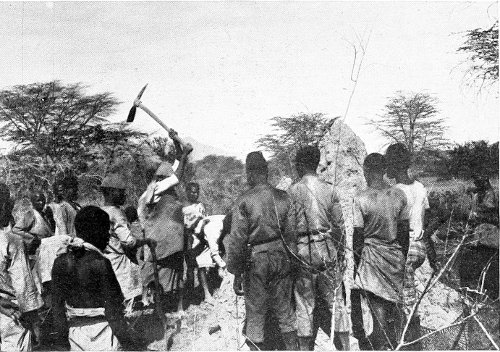 But the wily beasts do not come a second time, and we are obliged to await morning to follow their tracks in the hope of luck. The Wandorobo on ahead, I and two of my men following, make up the small caravan, while some of my other followers remain behind at the watering-place in a rough camp. I have provided myself with all essentials for two or three days, including a supply of water contained in double-lined water-tight sacks. For hour after hour we follow the tracks clearly defined upon the still damp surface of the velt. Presently they lead us through endless stretches of shrubs and acacia bushes and bow-string hemp, then through the dried-up beds of rain-pools now sprouting here and there with luxuriant vegetation. Then again we come to stretches of scorched grass, featureless save for the footsteps of the elephants. As we advance I am enabled to note how the animals feed themselves in this desert-like region, from which they never wander any great distance. Here, stamping with their mighty feet, they have smashed some young tree-trunks 384 and shorn them of their twigs and branches; and there, with their trunks and tusks, they have torn the bark off larger trees in long strips or wider slices and consumed them. I observe, too, that they have torn the long sword-shaped hemp-stalks out of the ground, and after chewing them have dropped the fibres gleaming white where they lie in the sun. The sap in this plant is clearly food as well as drink to them. I see, too, that at certain points the elephants have gathered together for a while under an acacia tree, and have broken and devoured all its lower branches and twigs. At other places it is clear that they have made a longer halt, from the way in which the vegetation all around has been reduced to nothing. We go on and on, the mighty footsteps keeping us absorbed and excited. We know that the chances are all against our overtaking the elephants, but the pleasures of the chase are enough to keep up our zest. At any moment, perhaps, we may come up with our gigantic fugitives. Perhaps!