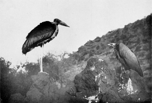 The numbers and varieties of birds are in truth almost bewildering to the spectator. Here is a marabou which has had its midday drink and is keeping company for the moment with a pair of fine-looking saddled storks (Ephippiorhynchus senegalensis, Shaw); there great regiments of crested cranes; single specimens of giant heron (Ardea goliath, Cretzschm.) keep on the look-out for fish in a quiet creek; on the sandbanks, and in among the thickets alongside, a tern (Œdicnemus vermiculatus, Cab.) is enjoying a sense of security. Near it are gobbling Egyptian geese and small plovers. A great number of cormorants now fly past, some of them settling on the branches of a tree which has fallen into the water. They are followed by Tree-geese (Dendrocygna viduata, L.), 331 332 333 some plovers and night-herons, numerous sea-swallows as well as seagulls; snipe (Gallinago media, Frisch.), and the strange painted snipe (Rostratula bengalensis, L.), the Actophylus africanus, and marsh-fowl (Ortygometra pusilla obscura, Neum.), spurred lapwing (Hoplopterus speciosus, Lcht.), and many other species. Now there rings out, distinguishable from all the others, the clear cry—to me already so familiar and so dear—of the screeching sea-eagle, that most typical frequenter of these riverside regions of Africa and so well meriting its name. A chorus of voices, a very Babel of sound, breaks continually upon the ear, for the varieties of small birds are also well represented in this region. The most beautiful of all are the cries of the organ-shrike and of the sea-eagle. The veritable concerts of song, however, that you hear from time to time are beyond the powers of description, and can only be cherished in the memory.