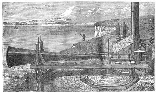 “The temperature of the air over the land where the fog-signal is located being very different from that over the sea, the sound, in passing from the former to the latter, undergoes reflection at their surface of contact. The 22correctness of this view is rendered more probable by the fact that, when the sound is thus impeded in the direction of the sea, it has been observed to be much stronger inland.