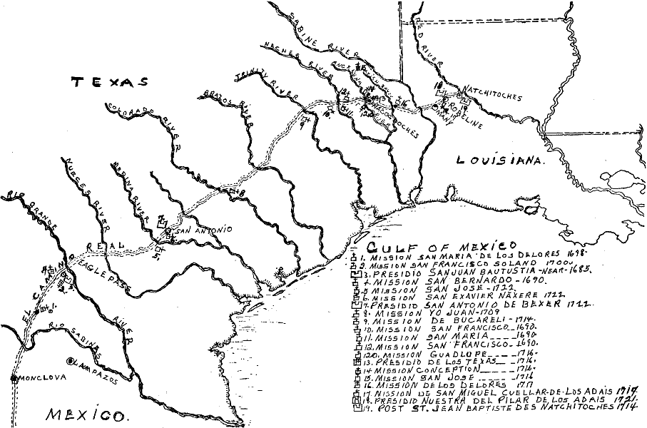 El Camino Real, The Royal Road, The King’s Highway, The Contraband Trail, The Old San Antonio Trace, The Old Texas Trail, and, lastly, Louisiana Highways 6 and 21 through Texas. This Southland’s busiest highway served the outlaw, the murderer, the slave trader, and the priest, as well as the sinner. Regardless of which direction one traveled he had to pass the Adais and the Neutral Strip—this area so filled with love, hate, jealousy, generosity, selfishness, prosperity, and despair. If at all this be possible, then this was El Camino Real, Los Adais and the Neutral Strip.