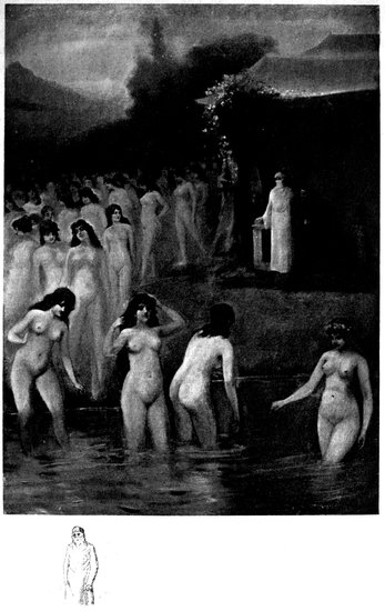 She said, It hath reached me, O auspicious King, that after the departure of the damsels, Hasan sat in the palace sad and solitary and his breast was straitened by severance. He used to ride forth a-hunting by himself in the wold and bring back the game and slaughter it and eat thereof alone: but melancholy and disquiet redoubled on him, by reason of his loneliness. So he arose and went round about the palace and explored its every part; he opened the Princesses’ apartments and found therein riches and treasures fit to ravish the beholder’s reason; but he delighted not in aught thereof, by reason of their absence. His heart was fired by thinking of the door they had charged him not to approach or open on any account and he said in himself, “My sister had never enjoined me not to open this door, except there were behind it somewhat whereof she would have none to know; but, by Allah, I will arise and open it and see what is within, though within it were sudden death!” Then he took the key and, opening the door,[50] saw therein no treasure but he espied a vaulted and winding staircase of Yamani onyx at the upper end of the chamber. So he mounted the stair, which brought him out upon the terrace-roof of the palace, whence he looked down upon the gardens and vergiers, full of trees and fruits and beasts and birds warbling praises of Allah, the One, the All-powerful; and said in himself “This is that they forbade to me.” He gazed upon these pleasaunces and saw beyond a surging sea, dashing with clashing billows, and he ceased not to explore the palace right and left, till he ended at a pavilion builded with alternate courses, two bricks of gold and one of silver and jacinth and emerald and supported by four columns. And in the centre he saw a sitting-room paved and lined with a mosaic of all manner precious stones such as rubies and emeralds and balasses and other jewels of sorts; and in its midst stood a basin[51] brimful of water, over 30which was a trellis-work of sandal-wood and aloes-wood reticulated with rods of red gold and wands of emerald and set with various kinds of jewels and fine pearls, each sized as a pigeon’s egg. The trellis was covered with a climbing vine, bearing grapes like rubies, and beside the basin stood a throne of lign-aloes latticed with red gold, inlaid with great pearls and comprising vari-coloured gems of every sort and precious minerals, each kind fronting each and symmetrically disposed. About it the birds warbled with sweet tongues and various voices celebrating the praises of Allah the Most High: brief, it was a palace such as nor Cæsar nor Chosroës ever owned; but Hasan saw therein none of the creatures of Allah, whereat he marvelled and said in himself, “I wonder to which of the Kings this place pertaineth, or is it Many-Columned Iram whereof they tell, for who among mortals can avail to the like of this?” And indeed he was amazed at the spectacle and sat down in the pavilion and cast glances around him marvelling at the beauty of its ordinance and at the lustre of the pearls and jewels and the curious works which therein were, no less than at the gardens and orchards aforesaid and at the birds that hymned the praises of Allah, the One, the Almighty; and he abode pondering the traces of him whom the Most High had enabled to rear that structure, for indeed He is muchel of might.[52] And presently, behold, he espied ten birds[53] 31flying towards the pavilion from the heart of the desert and knew that they were making the palace and bound for the basin, to drink of its waters: so he hid himself, for fear they should see him and take flight. They lighted on a great tree and a goodly and circled round about it; and he saw amongst them a bird of marvel-beauty, the goodliest of them all, and the nine stood around it and did it service; and Hasan marvelled to see it peck them with its bill and lord it over them while they fled from it. He stood gazing at them from afar as they entered the pavilion and perched on the couch; after which each bird rent open its neck-skin with its claws and issued out of it; and lo! it was but a garment of feathers, and there came forth therefrom ten virgins, maids whose beauty shamed the brilliancy of the moon. They all doffed their clothes and plunging into the basin, washed and fell to playing and sporting one with other; whilst the chief bird of them lifted up the rest and ducked them down, and they fled from her and dared not put forth their hands to her. When Hasan beheld her thus he took leave of his right reason and his sense was enslaved, so he knew that the Princesses had not forbidden him to open the door save because of this; for he fell passionately in love with her, for what he saw of her beauty and loveliness, symmetry and perfect grace, as she played and sported and splashed the others with the water. He stood looking upon them whilst they saw him not, with eye gazing and heart burning and soul[54] to evil prompting; and he sighed to be with them and wept for longing, because of the beauty and loveliness of the chief damsel. His mind was amazed at her charms and his heart taken in the net of her love; lowe was loosed in his heart for her sake and there waxed on him a flame, whose sparks might not be quenched, and desire, whose signs might not be hidden. Presently, they came up out of that basin, whilst Hasan marvelled at their beauty and loveliness and the tokens of inner gifts in the elegance of their movements. Then he cast a glance at the chief damsel who stood mother-naked and there was manifest to him what was between her thighs 32a goodly rounded dome on pillars borne, like a bowl of silver or crystal, which recalled to him the saying of the poet:[55]—