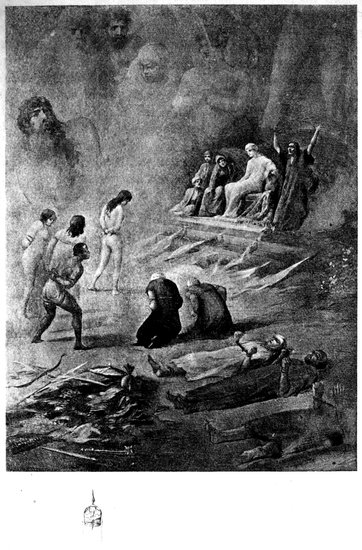 She resumed, It hath reached me, O auspicious King, that when Hasan beheld himself fallen into the hands of the damned Persian he bespoke him softly but gained naught thereby for the Ajami cried out at him in wrath, so he was silent, knowing that the Fate-shaft had shot him. Then the accursed bade loose his pinion-bonds and they gave him a little water to drink, whilst the Magian laughed and said, “By the virtue of the Fire and the Light and the Shade and the Heat, methought not thou wouldst fall into my nets! But the Fire empowered me over thee and helped me to lay hold upon thee, that I might win my wish and return and make thee a sacrifice[25], to her[26] so she may accept of me.” Quoth Hasan, “Thou hast foully betrayed bread and salt”; whereupon the Magus raised his hand and dealt him such a buffet that he fell and, biting the deck with his fore-teeth, swooned away, whilst the tears trickled down his cheeks. Then the Guebre bade his servants light him a fire and Hasan said, “What wilt thou do with it?” Replied the Magian, “This is the Fire, lady of light and sparkles bright! This it is I worship, and if thou wilt worship her even as I, verily I will give thee half my monies and marry thee to my maiden daughter.” Thereupon Hasan cried angrily at him, “Woe to thee! Thou art a miscreant Magian who to Fire dost pray in lieu of the King of Omnipotent sway, Creator of Night and Day; 17and this is naught but a calamity among creeds!” At this the Magian was wroth and said to him, “Wilt thou not then conform with me, O dog of the Arabs, and enter my faith?” But Hasan consented not to this: so the accursed Guebre arose and prostrating himself to the fire, bade his pages throw him flat on his face. They did so, and he beat him with a hide whip of plaited thongs[27] till his flanks were laid open, whilst he cried aloud for aid but none aided him, and besought protection, but none protected him. Then he raised his eyes to the All-powerful King and sought of Him succour in the name of the Chosen Prophet. And indeed patience failed him; his tears ran down his cheeks, like rain, and he repeated these couplets twain:—