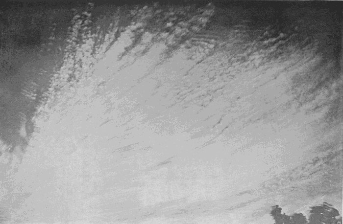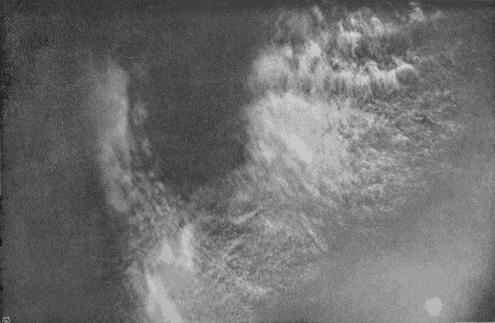 There is no difficulty whatever in securing excellent photographs of heavy grey clouds, or of clouds which stand out dark against a twilight sky. Any camera and any plate can be used, and in an experienced hand will ensure success after a few trials, but except under these special conditions, cirrus, in all its varieties, the alto clouds, and even[166] many of the lower ones, present a real difficulty due to two causes. In the first place, they and their surroundings are so brilliant that a very short exposure is sufficient, far shorter than would be needed for a sunlit landscape; and in the second place, the actinic value of the light they reflect is very little greater than that received from the background of blue sky. When so minute a difference comes to be represented in the monochrome of the ordinary photograph, the eye fails to appreciate it, and all the finer details are lost.