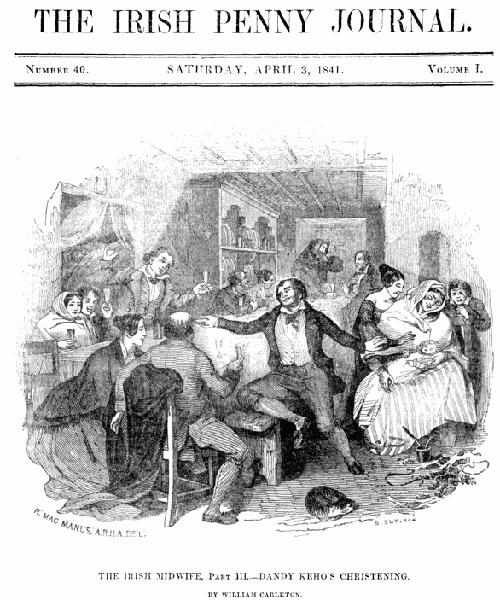 The following Sunday morning, Rose paid an early visit to her patient, for, as it was the day of young Dandy’s christening, her presence was considered indispensable. There is, besides, something in the appearance and bearing of a midwife upon those occasions which diffuses a spirit of buoyancy and light-heartedness not only through the immediate family, but also through all who may happen to participate in the ceremony, or partake of the good cheer. In many instances it is known that the very presence of a medical attendant communicates such a cheerful confidence to his patient, as, independently of any prescription, is felt to be a manifest relief. So is it with the midwife; with this difference, that she exercises a greater and more comical latitude of consolation than the doctor, although it must be admitted that the one generally falls woefully short of that conventional dress with which we cover nudity of expression. No doubt many of her very choicest stock jokes, to carry on the metaphor, are a little too fashionably dressed to pass current out of the sphere in which they are used; but be this as it may, they are so traditional in character, and so humorous in conception, that we never knew the veriest prude to feel offended, or the morosest temperament to maintain its sourness, at their recital. Not that she is at all gross or unwomanly in any thing she may say, but there is generally in her apothegms a passing touch of fancy—a quick but terse vivacity of insinuation, at once so full of fun and sprightliness, and that truth which all know but few like to acknowledge, that we defy any one not irretrievably gone in some incurable melancholy to resist her humour. The moment she was seen approaching the house, every one in it felt an immediate elevation of spirits, with the exception of Mrs Keho herself, who knew that wherever Rose had the arrangement of the bill of fare, there was sure[Pg 314] to be what the Irish call “full an’ plinty”—“lashins an’ lavins”—a fact which made her groan in spirit at the bare contemplation of such waste and extravagance. She was indeed a woman of a very un-Irish heart—so sharp in her temper and so penurious in soul, that one would imagine her veins were filled with vinegar instead of blood.