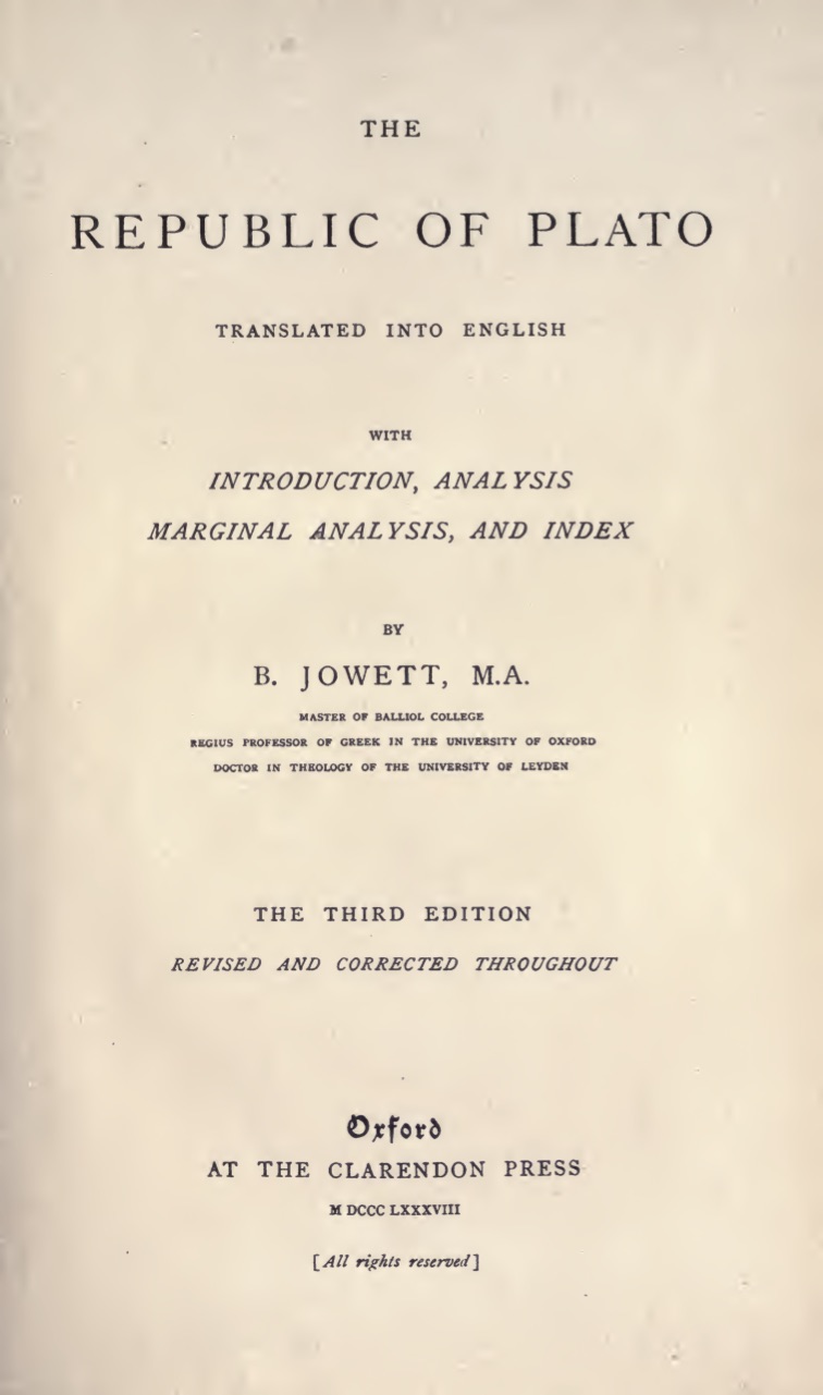 IN publishing a third edition of the Republic of Plato (originally included in my edition of Plato’s works), I have to acknowledge the assistance of several friends, especially of my secretary, Mr. Matthew Knight, now residing for his health at Davôs, and of Mr. Frank Fletcher, Exhibitioner of Balliol College. To their accuracy and scholarship I am under great obligations. The excellent index, in which are contained references to other dialogues as well as to the Republic, is entirely the work of Mr. Knight. I am also considerably indebted to Mr. J. W. MacKail, Fellow of Balliol College, who read over the whole book in the previous edition, and noted several inaccuracies.