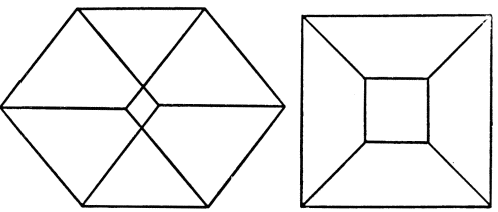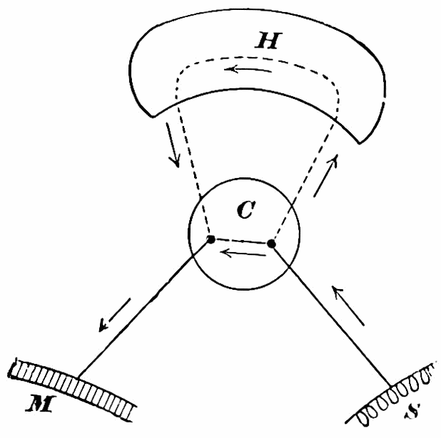 [15] The ordinary mixing of pigments is not an addition, but rather, as Helmholtz has shown, a subtraction, of lights. To add one color to another we must either by appropriate glasses throw differently colored beams upon the same reflecting surface; or we must let the eye look at one color through an inclined plate of glass beneath which it lies, whilst the upper surface of the glass reflects into the same eye another color placed alongside—the two lights then mix on the retina; or, finally, we must let the differently colored lights fall in succession upon the retina, so fast that the second is there before the impression made by the first has died away. This is best done by looking at a rapidly rotating disk whose sectors are of the several colors to be mixed.