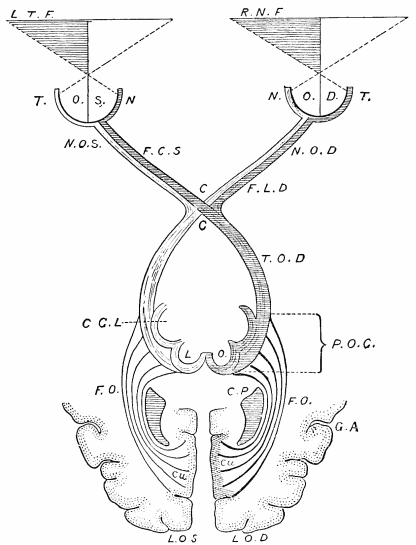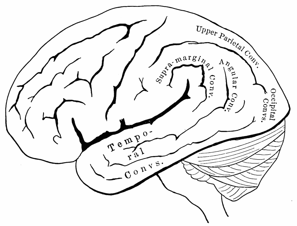 [3] Thus the optic nerve-fibres are traced to the occipital lobes, the olfactory tracts go to the lower part of the temporal lobe (hippocampal convolution), the auditory nerve-fibres pass first to the cerebellum, and probably from thence to the upper part of the temporal lobe. These anatomical terms used in this chapter will be explained later. The cortex is the gray surface of the convolutions.