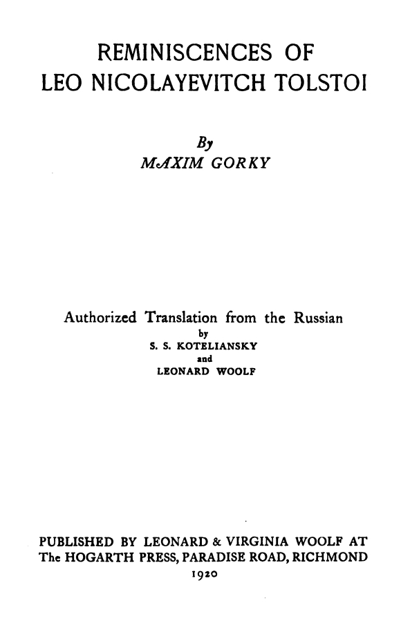 Reminiscences of Leo Nicolayevitch Tolstoi, by Maxim Gorky, was originally published in Russian in Petrograd in 1919. The first half of the book, consisting of notes, had been written between 1900 and 1901, when Tolstoi, Gorky, and Tchekhov were living in the Crimea. The second half consists of a letter written by Gorky in 1910.