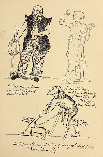 In the year 1566, Thomas Harman, Esq., probably a justice of peace, published a very singular and amusing work, entitled, "A Caveat, or Warning for Common Cursetors (runners) vulgarely called Vagabones;" in which he has described the several sorts of thieving beggars and other rogues with considerable humour, and has collected together a great number of words belonging to what he humorously calls the "leud lousey language of these lewtering luskes and lazy lorrels, wherewith they bye and sell the common people as they pas through the countrey." He says they term this language Pedlar's French, or, Canting, which had not then been invented above thirty years. As the book has lately been reprinted, it will be proper, on this occasion, to use it more sparingly, and to mention only such of Harman's vagabonds as fall under the begging class. These are 1. The Rufflers; particularly mentioned in the Stat. xxvii. Henry VIII. against vagabonds, as fellows pretending to be wounded soldiers. These, says Harman, after a year or two's practice, unless they be prevented by twined hemp, become,—2. Upright Men; still pretending to have served in the wars, and offering, though never intending, to work for their living. They decline receiving meat or drink, and take nothing but money by way of charity, but contrive to steal pigs and poultry at night, chiefly plundering the farmers. Of late, says the author, they have been much whipped at fairs. They attack and rob other beggars that do not belong to their own fraternity, occasionally admitting or installing them into it by pouring a quart of liquor on their pates, with these words, "I do stall thee, W. T., to the rogue, and that from henceforth it shall be lawful for thee to cant for thy living in all places." All sorts of beggars are obedient to them, and they surpass all the rest in pilfering and stealing. 3. Hookers, or Anglers; these knaves beg by day, and pilfer at night, by means of a pole with a hook at the end, with which they lay hold of linen, or any thing hanging from windows or elsewhere. The author relates a curious feat of dexterity practised by one of them at a farm house, where, in the dead of the night, he contrived to hook off the bed-clothes from three men who were lying asleep, leaving them in their shirts, and when they awoke from cold, supposing, to use the author's words, "that Robin Goodfellow had bene with them that night." 4. Rogues; going about with a white handkerchief tied round the head, and pretending to be lame. These people committed various other frauds and impostures, in order to obtain charity. 5. Pallyards; with patched garments, collecting, by way of alms, provisions, or whatever they could get, which they sold for ready money; they are chiefly Welshmen, and make artificial sores by applying spearwort to raise blisters on their bodies, or else arsenic or ratsbane to create incurable wounds. 6. Abraham Men; pretending to be lunatics, who have been a long time confined in Bedlam or some other prison, where they have been unmercifully used with blows, &c. They beg money or provisions at farmers' houses, or bully them by fierce looks or menaces. 7. Traters; or fellows travelling about {13} the country with black boxes at the girdle, containing forged briefs, or licences to beg for hospitals. Some have clouts bound round their legs, and walk as if lame, with staves in their hands. 8. Freshwater Mariners, or Whipjacks; whose ships, says the witty author, were drowned in Salisbury Plain. These counterfeit great losses at sea by shipwreck and piracy, and are chiefly Irishmen, begging with false licences, under the supposed seal of the Admiralty, so artfully constructed as to deceive even the best lawyers. 9. The Counterfeit Crank; who is described at large, with a figure, in another part of this work. 10. Dommerars; chiefly Welshmen, pretending to be dumb, and forcibly keeping down their tongues doubled, groaning for charity, and keeping up their hands most piteously, by which means they procure considerable gains. 11. Demanders for glymmar; who are chiefly women that go about with false licences to beg, as sufferers from fire,—glymmar, in pedlars' language, signifying that element. Many other classes are enumerated in this curious volume, as—priggars of prauncers, swadders, jarkman, patricos, bawdy baskets, autem morts, walking morts, doxies, dells, kynchin morts, and kynchin coes; but all these are rather pilferers than beggars.