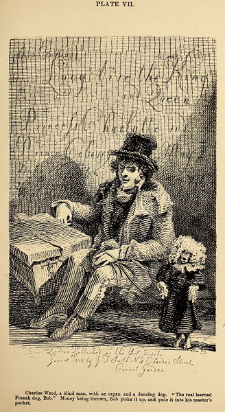 The ensuing etching is of Charles Wood, a blind man, with an organ and a dancing dog, which he declares to be "The real learned French dog, Bob," and extols his tricks by the following never-failing address, "Ladies and Gentlemen, this is the real learned French dog; please to encourage him; throw any thing down to him, and see how nimbly he'll pick it up, and give it to his poor blind master. Look about, Bob; be sharp; see what you're about, Bob." Money being thrown, Bob picks it up, and puts it into his master's pocket. "Thank ye, thank ye, my good masters; should any more Ladies and Gentlemen wish to encourage the poor dog, he's now quite in the humour; he'll pick it up almost before you can throw it down." It is needless to add, that this man, whose station is against Privy Garden Wall, makes what is called "a pretty penny" by his learned French friend.