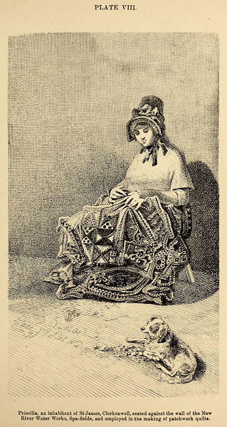 The female figure is that of Priscilla, an inhabitant of St James, Clerkenwell, who is often to be seen in the summer seated against the wall of the Reservoir of the New River Water-works, Spa-fields, and employed in the making of patchwork quilts. She threads her own needle, cuts her own patches, and fits them entirely herself.