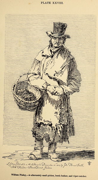 The environs produce characters equally curious with those of London, particularly among that order of people called Simplers, whose business it is to gather and supply the city markets with physical herbs. Such an innocent instance of rustic simplicity is William Friday, whose portrait is exhibited in the following plate. This man starts from Croydon, with champignons, mushrooms, &c., and is alternately snail-picker, leech-bather, and viper-catcher.