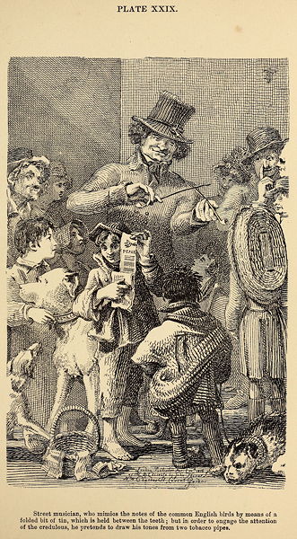 The man whose portrait is given in the succeeding plate, mimics the notes of the common English birds by means of a folded bit of tin, similar to that used by Mr Punch's orator, and which is held between the teeth; but in order to engage the attention of the credulous, he pretends, as his lips are nearly closed, to draw his tones from two tobacco-pipes, using one for the fiddle, the other for the bow, and never fails to collect an attentive audience, either in the street or tap-room.