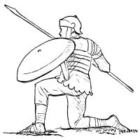 The defensive body-armor of the Greeks consisted of a close-fitting leather jerkin terminating at the hips. Strips of leather loosely connected together sprang from the bottom of this jerkin, and reached nearly half-way down the thigh. Both the jerkin and the strips of this petticoat were often strengthened by bands of metal. Armor was also worn below the knees. These greaves protected the shins, but did not encircle the whole leg.{18}