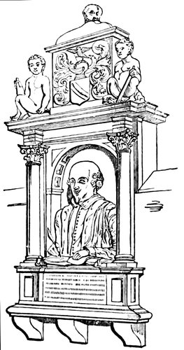 Montaigne’s health had been declining for some time; he was afflicted with gravel and cholic, and he was obstinately resolved against consulting physicians. In September, 1592, he fell ill of a malignant quinsy, which kept him speechless for three days, during which he had recourse to his pen to signify to his wife his last intentions. He desired that several gentlemen of the neighbourhood should be requested to come and take leave of him. When they were assembled in his room, a priest said mass, and at the elevation of the host, Montaigne half raised himself on his bed, with his hands joined together, and in that attitude expired, September 13, 1592, in the sixtieth year of his age. His body was buried at Bordeaux, in the church of the Feuillans, where a monument was erected to him by his widow. He left an only daughter, heiress of his property.