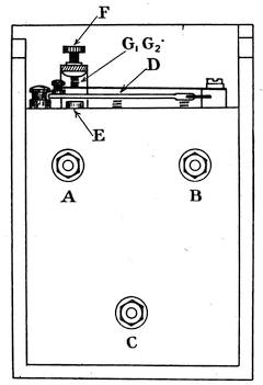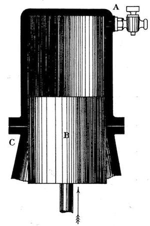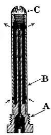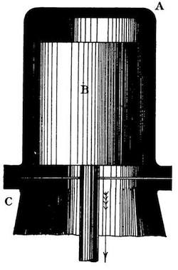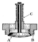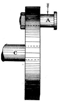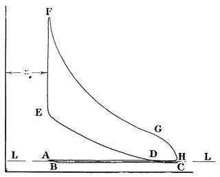 Considering for a moment just the small strip efdc of the diagram we see that it is easy to find a rectangle abcd equal in area to it. Now the height of this rectangle will be the average value of the force while it traversed the104 space cd, and hence the area of the rectangle abcd gives the work done by the force in passing from c to d. Similarly by dividing up the whole diagram we would obtain a number of little rectangles each equal in area to the magnitude of the work done from point to point. Thus the whole area ABCD gives the whole work done. To measure the work done in an engine cylinder we must use some form of indicator. An indicator is an instrument which traces out a diagram on which abscissæ (or horizontal distances) represent displacements of the piston and ordinates (or vertical distances) represent the pressures acting on the piston.